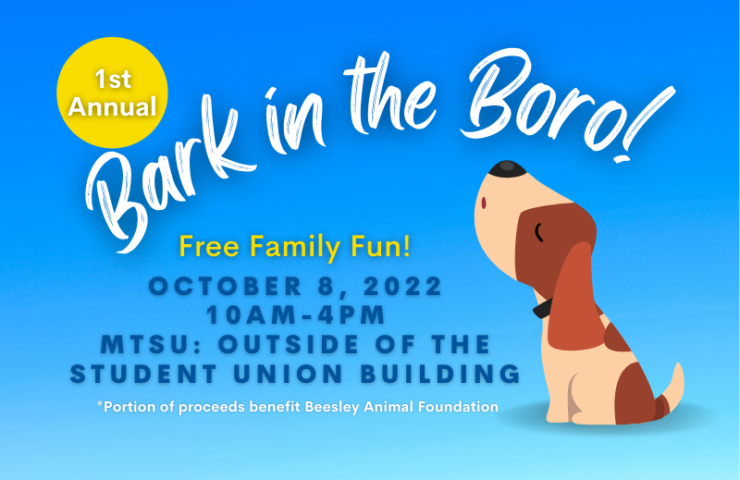 The parent company of Waggin’ Tails, Connect Media Group (CMG), is hosting the inaugural Bark in the Boro! The event is on October 8, 2022 from 10 a.m – 4 p.m. outside the Student Union Building on the campus of Middle Tennessee State University (MTSU). A portion of the proceeds will be donated to Beesley Animal Clinic located in Murfreesboro.