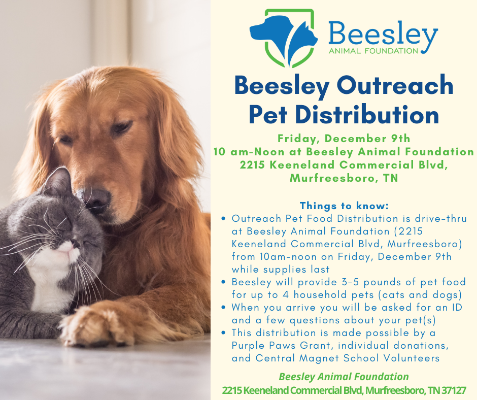 - Outreach Pet Food Distribution is drive-thru at Beesley Animal Foundation (2215 Keeneland Commercial Blvd, Murfreesboro) from 10 a.m. to 12 p.m. on Friday, December 9 while supplies last